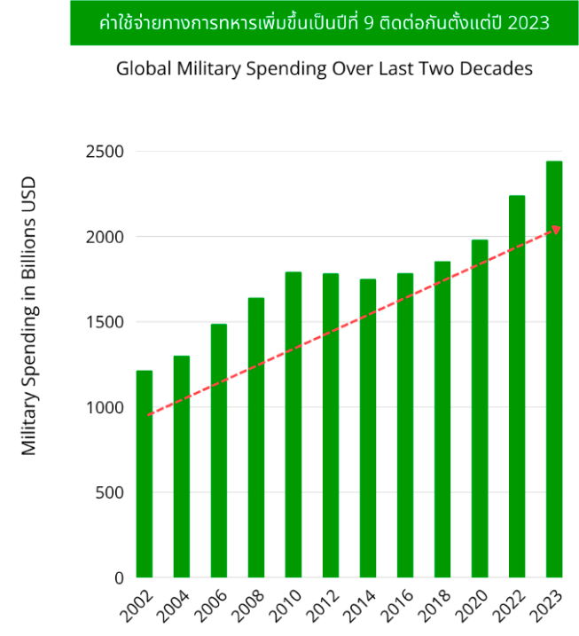 จากข้อมูลชี้ให้เห็นว่าการใช้จ่ายทางการทหารทั่วโลกทะลุ 2 ล้านล้านดอลลาร์สหรัฐเป็นครั้งแรก ในปี 2022 และเพิ่มสูงสุดเป็นประวัติการณ์ที่ 2.44 ล้านล้านดอลลาร์สหรัฐในปี 2023 โดยมีสาเหตุมาจากความตึงเครียดทางภูมิศาสตร์การเมืองที่เกิดใหม่